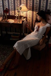 Designed and proudly made in New York City, USA. A cotton eyelet version of our Maria dress that is lady length with sweetheart neckline, princess seams and an elastic cap sleeve. Ladder lace trim and silk charmeuse ties along neckline, side seam slits on both sides of the dress and invisible zipper on side seam closure. This dress is fully lined.